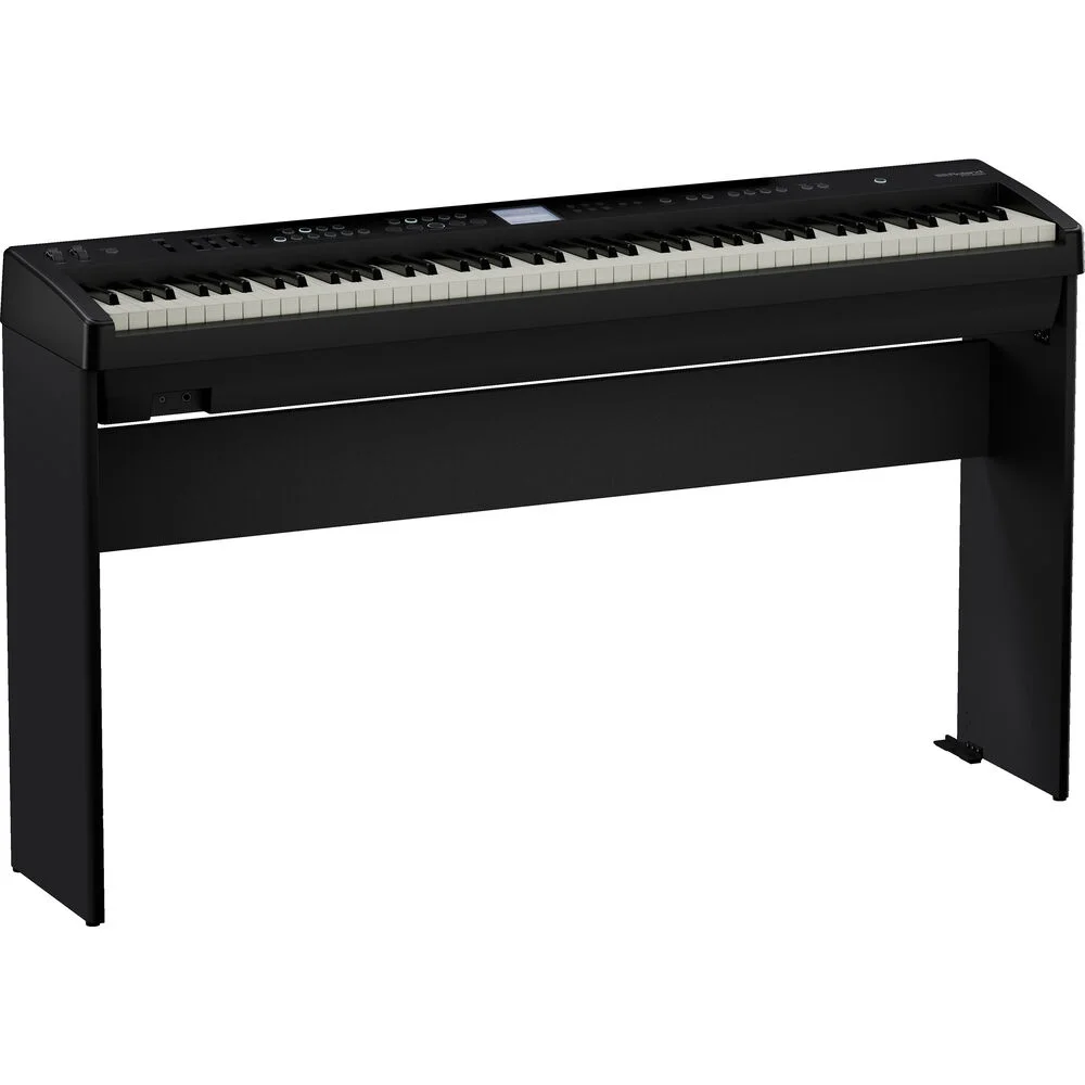 The black Roland KSFE50 is a custom stand for the FP-E50 digital piano. Its elegant design creates a unified upright-piano look for your instrument. The KSFE50 provides a stable and secure platform and brings your piano to the perfect playing height.