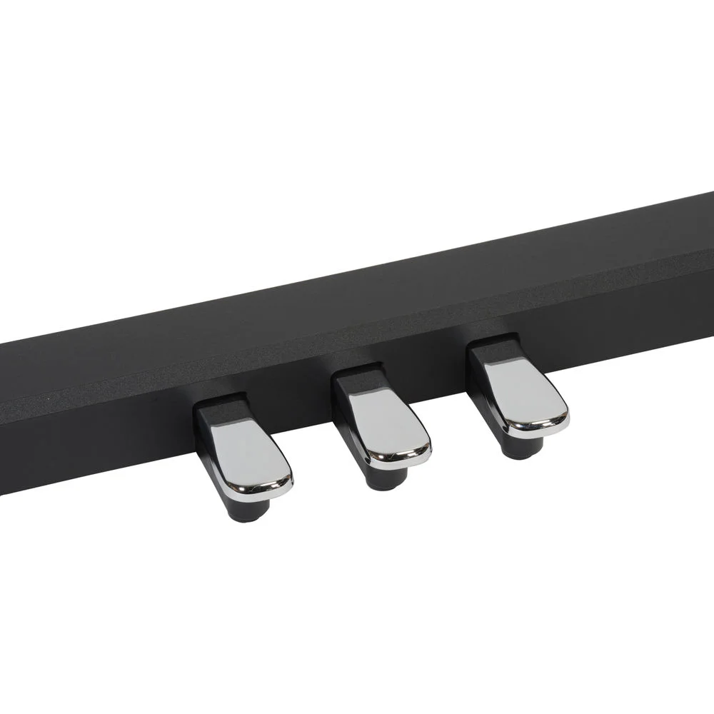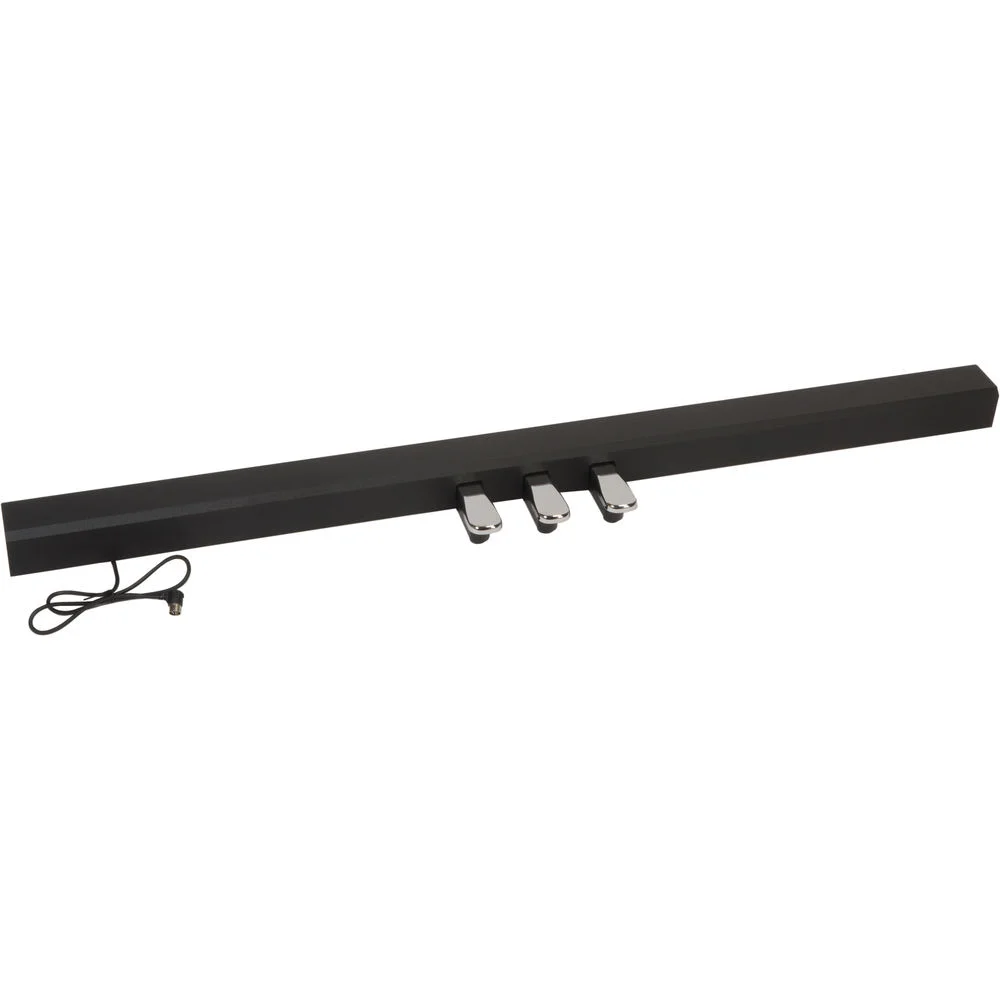 The black Roland KPD-70 is a three-pedal unit for FP-30 and FP-30X digital pianos, which provides sustain, sostenuto, and the soft control that is commonly found on grand pianos. Additionally, when connected, one of the foot pedals can be used for hands-free turning of onscreen music pages while using mobile apps such as piaScore and Sheet Music Direct.