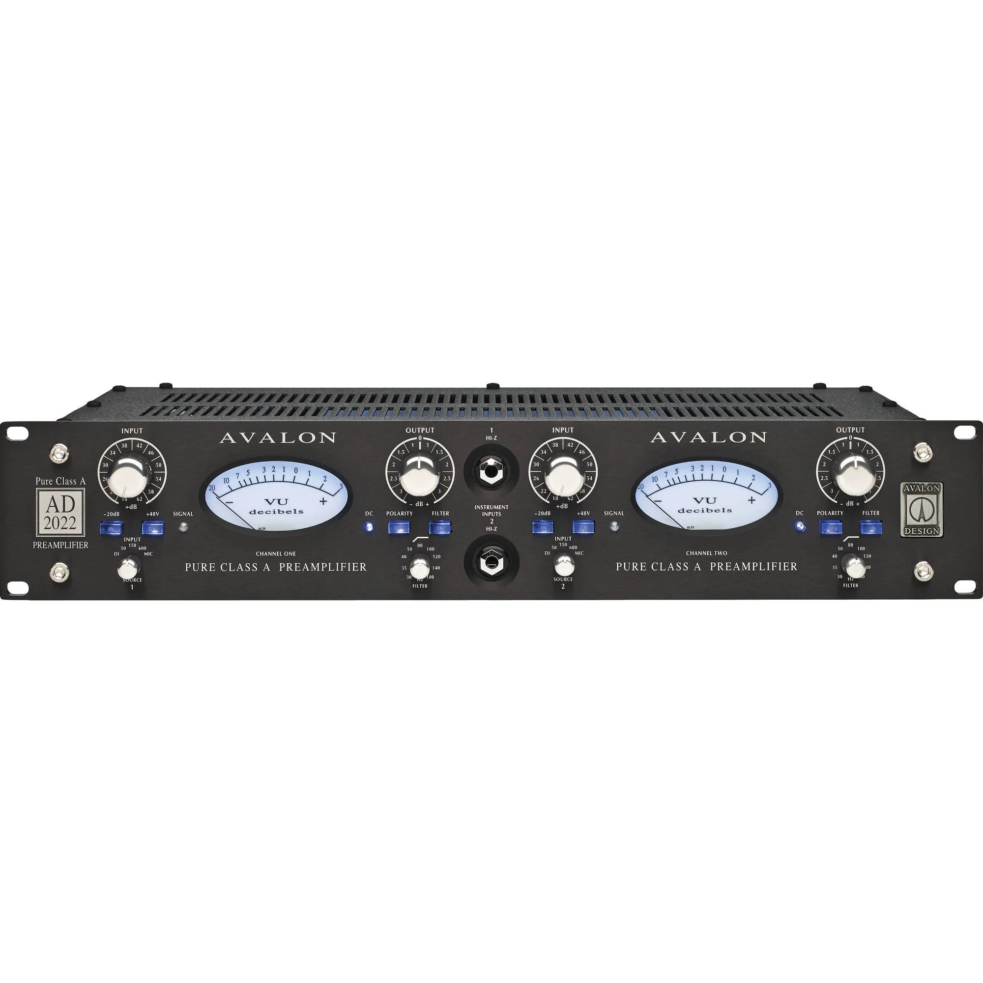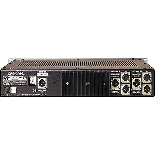 The Avalon Design AD2022 is Avalon’s fourth generation of fully discrete, symmetrical Pure Class A microphone preamplifiers. The dual mono Avalon Design AD2022 includes the original sonic capabilities and transparency of the M2, M22 and M5 preamplifiers plus several additional features. These include selectable microphone source loading for optimized cable/microphone matching, improved high-voltage Class A regulated power supplies, two high Z instrument inputs, variable-passive high pass filter and doubled plated circuit boards for superior low level signal transfer.