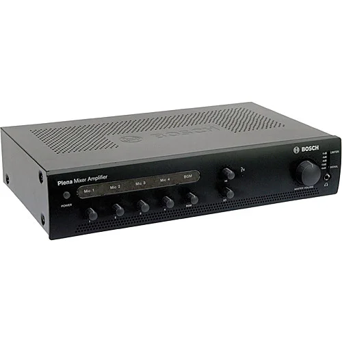 The Bosch PLE‑1ME120 is a high‑performance 120‑watt mixer amplifier from Bosch’s Plena series. Designed for public‑address (PA), background music (BGM), or announcement systems in commercial, educational, hospitality, and institutional settings, this mixer amplifier combines power, versatility, and ease of use. With multiple inputs (microphone, line, music), priority announcement features, tone controls, and robust build, it’s an all‑round solution for venues that need dependable audio where clarity, power, and control matter.